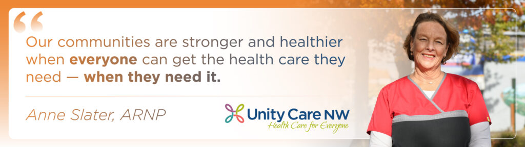 For Slater, that mission is personal. “A person experiencing homelessness lives, on average, 30 years less than someone with stable housing,” she says. “At Unity Care NW, we’re working to change that, one patient at a time.”